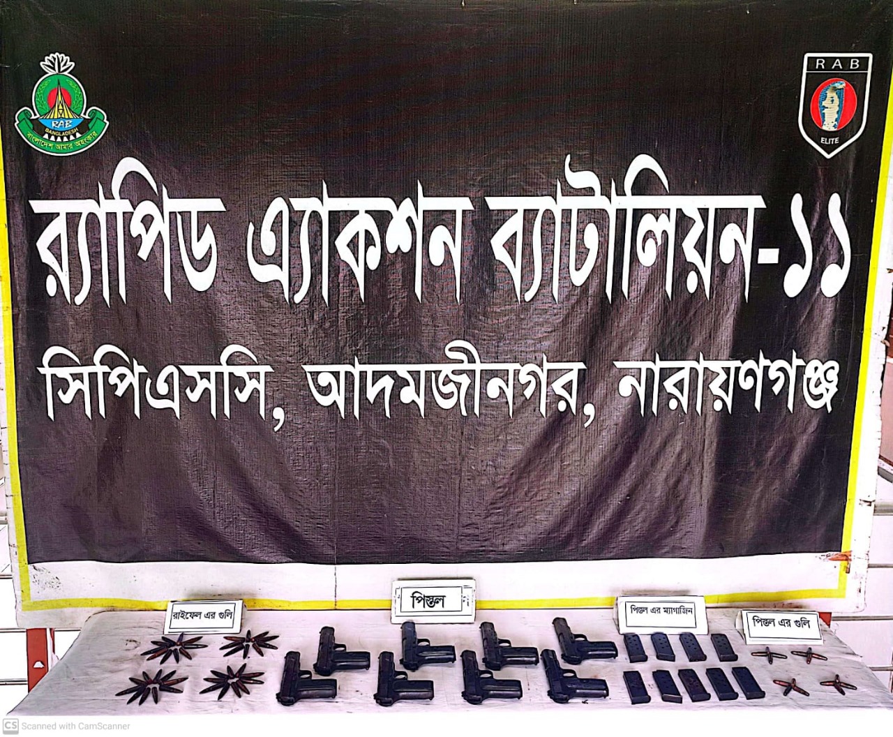 র্যাব-১১ নারায়ণগঞ্জ এর একটি চৌকস গোয়েন্দা টীম থানা হতে লুট হওয়া অস্ত্র-গোলাবারুদ উদ্ধারের জন্য আড়াইহাজার থানা এলাকায় গোয়েন্দা নজরদারী বৃদ্ধি করে। এরই প্রেক্ষিতে র্যাব-১১ নারায়ণগঞ্জ কর্তৃক নিজস্ব গোয়েন্দা তৎপরতার মাধ্যমে ১২ সেপ্টেম্বর ২০২৪ ইং তারিখ রাতে নারায়ণগঞ্জ জেলার আড়াইহাজার পৌরসভা এলাকায় অভিযান পরিচালনা করে একটি পুকুর হতে পরিত্যক্ত অবস্থায় ০৮টি পিস্তল, ০৯টি পিস্তলের ম্যাগাজিন, ১৬ রাউন্ড পিস্তলের গুলি, ৩৯টি রাউন্ড রাইফেলের গুলি উদ্ধার করতে সক্ষম হয়।